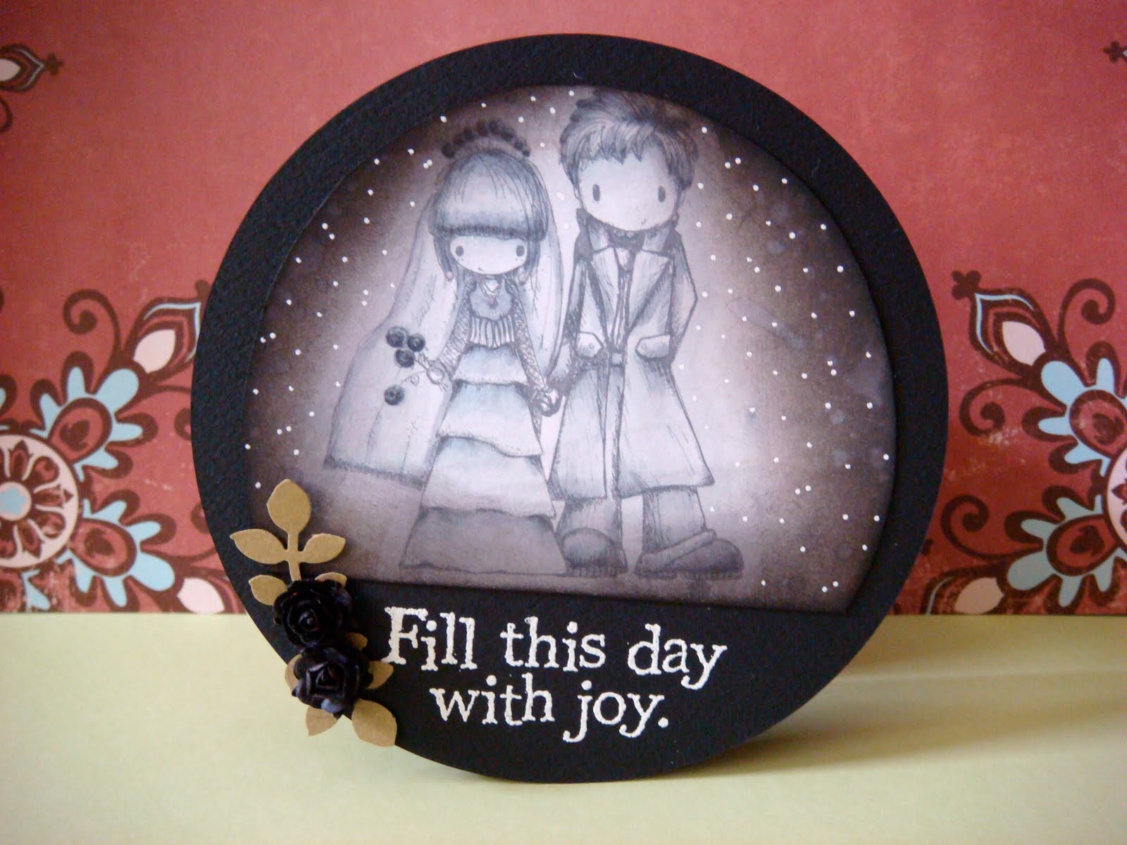 Check out this entry from last week by Donna. Ohhh, I just love it!!! She used Happy Couple from Tiddly Inks…the lovely spin she put on it is all her own genius, but the colors are almost identical to the ones I used today. I had already colored Gossmere and then found Donna’s card….great minds think alike. LOL