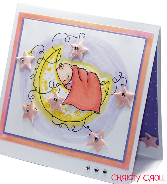 Hi Christy! This card is so cute!. I love the background you created around this little sweety and the doodles on the moon are a great addition to the image! The sweet little stars are the icing on the cake!