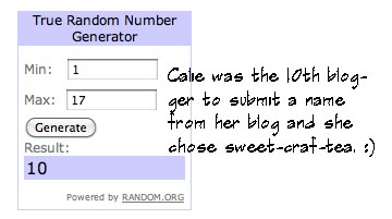 I chose 2 sets of winners from the pool of names the bloggers submitted (the commenter won and the blogger who submitted their name also won):