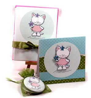 My daughter got invited to a birthday party for a little girl in her class and it is so hard to know which presents will go over or not, so I compromised and bought a little stuffed cat and then created this personalized set of gifts using Mavis (one of my rubber stamp designs from Stamping Bella).