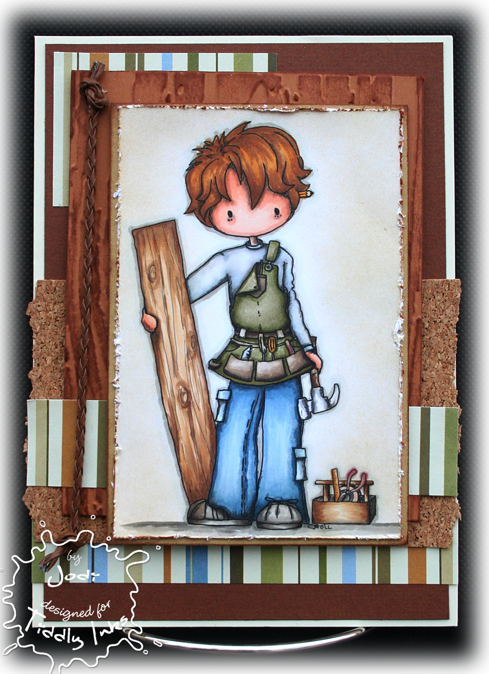 Time for another Tiddly Thursday Throwback today. This is a perfect image for the handy man in your life; brother, husband, best friend, uncle, or son! Jodi’s coloring is super amazing and you can find more of her wonderful work at Kaboo Designs. I love Jodi’s beautiful additions of the wood embossed background and that cork. Such a perfect manly card. Check it out below: